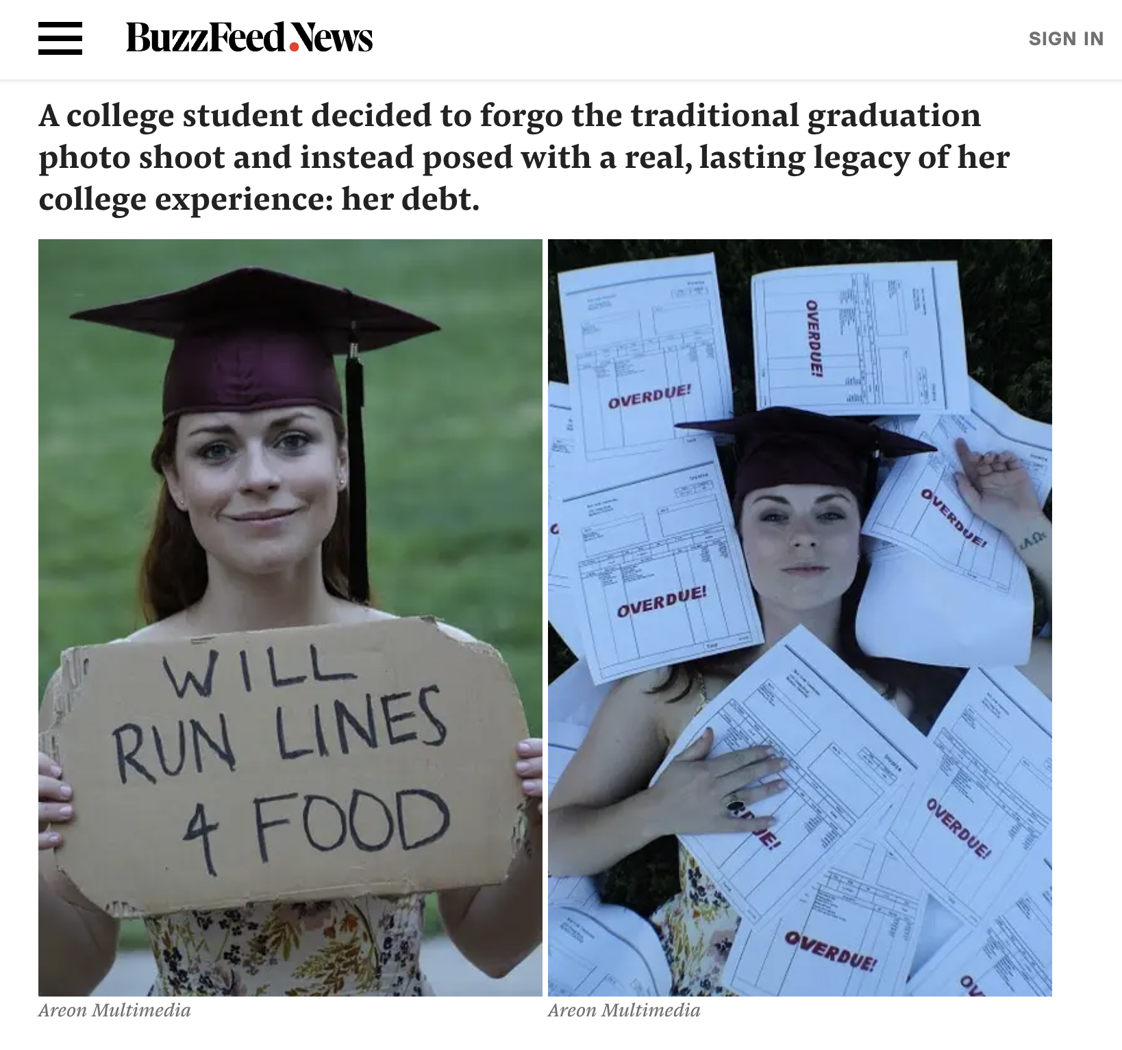 As a college sophomore, the ‘08 financial crisis hit my education plans like a bag of bricks. When I finally was able to return to school and complete my degree 8 years later, I had to make some jokes— at myself, the institution of education, the American debt industry, and the theatre majors who walk amongst us.